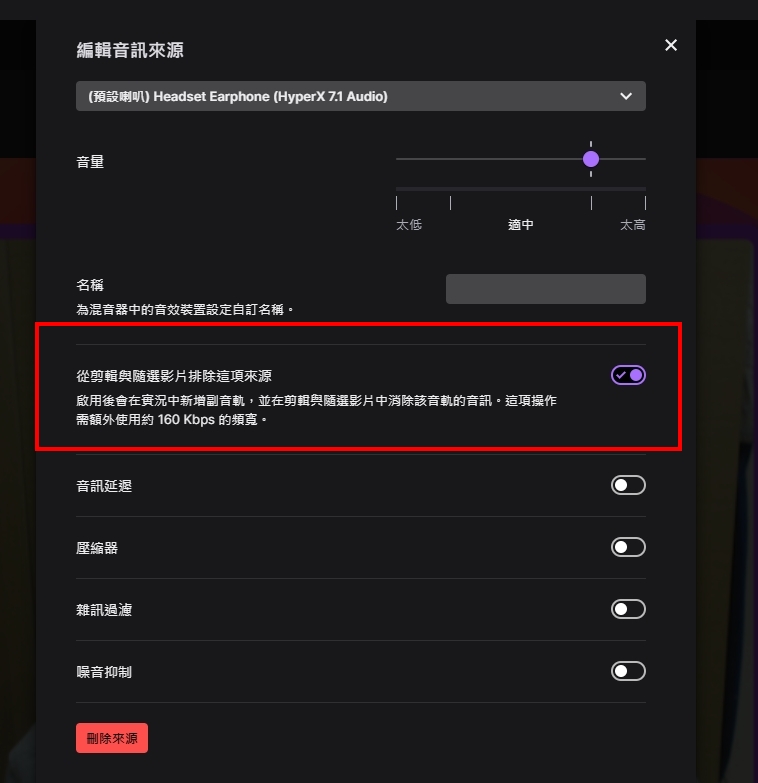 (2 確定進階音訊混音器中,在剪輯和隨選影片中排除特定來源的音訊,且 Live 實況的播放不會受到影響。只要進入個別音訊來源的一般音訊設定頁面,並開啟「從剪輯與隨選影片排除這項來源」設定,就能使用這項功能。